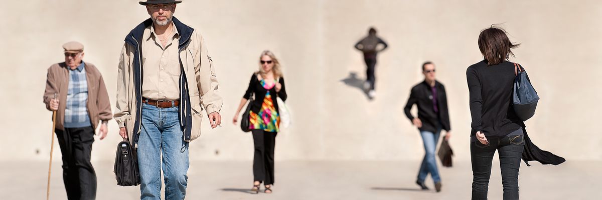 In May 2010, Nicolas Lefevre has photographed people walking through Antigone, a district in the city of Montpellier in southern France. He stood at both ends of the district for 2 weeks, and then put together some of these hundreds of photographs to create two long panoramic art installations exhibited on Place du Nombre d’Or in Montpellier. The series of photographs below represents the first part of the exhibited project.